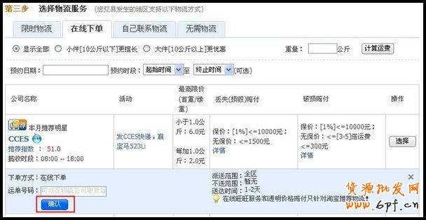 確認好第一、二步信息后,在第三步中選擇“在線下單”,在您所選擇的物流公司后點擊“選擇”。