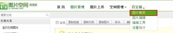 1、來到賣家后臺中心,進入“圖片空間”,找到“百寶箱”——“圖片搬家”如下圖。