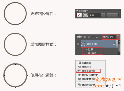 這里要注意的一點(diǎn)是,路徑一定要先選中才可以進(jìn)行布爾運(yùn)算。同時(shí),這里最后的一個(gè)合并形狀工具要小心使用,當(dāng)合并后,就不能再更改原來(lái)的路徑了,繼而取而代之的是一個(gè)新的路徑。只是這些用法在某些情況下還是可以用到的。