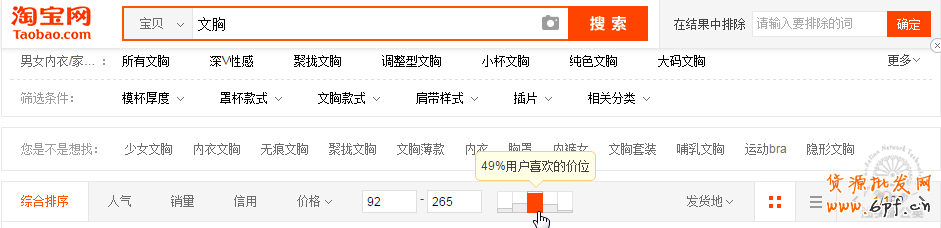 從行業的客單價分布上看,20元到300元這個價格區間的及成交量是最大的,而其中50-100個的成交最高。而在淘寶搜索中分析,接近一半的搜索人群對92元到265元價位的價格消費是熱度是最高的。
