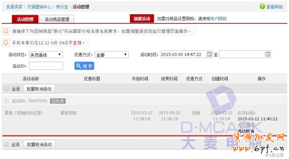 1、特價寶優惠活動重啟。目前在特價寶里創建的優惠活動如果失效了是不能重啟操作的,如果活動因為時間到期而失效,所有活動內的寶貝將會恢復原價,促銷價失效,這對店鋪會造成嚴重的影響,如果增加了一鍵重啟活動,就能快速響應,降低客服的接待壓力,減少不必要的麻煩。