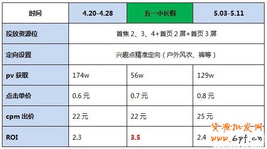 從上表圖我們可以看出,若在五一假期前后投放鉆展廣告,可獲取穩定的pv和cpc,在假期中ROI反而會有一個小爆發。因此在競價上建議: