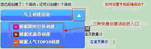 第四步,快速創建活動,點擊"馬上創建活動"旁邊的小三角按鍵,即出現下拉菜單,根據限時打折創建,根據優惠券創建,根據人氣TOP10創建.第一項是需要開通官方服務限時打折的,第二項是需要開通優惠券的服務的.