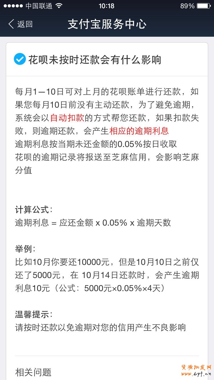 花唄的實質是將當期消費推遲至下個月的10之前進行支付,一次性付清,如果10日之前沒有主動還款,系統會自動扣款避免逾期;如果額度不夠扣款失敗,會有相應的逾期利息。逾期利息按照當期未還金額的0.05%按日收取,而逾期記錄將會影響芝麻信用。
