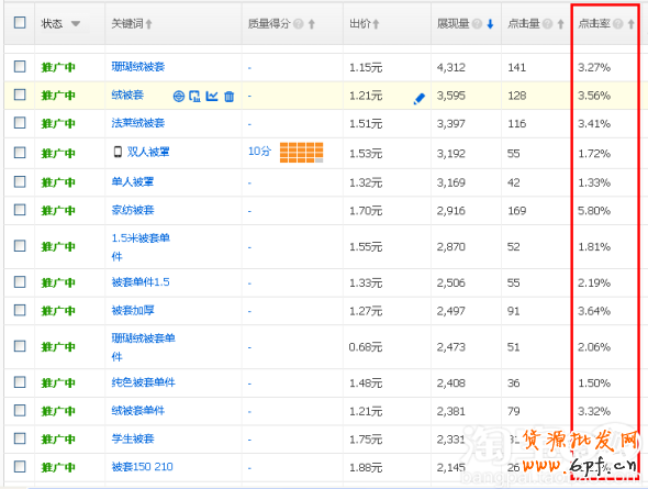 以關鍵詞“ 法蘭絨被套”為例 ,可發現影響點擊率幾個要點: