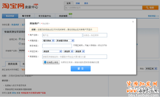 1、當搜索要關(guān)聯(lián)的商戶時,結(jié)果為空,則查找結(jié)果有“建議您”的信息,其中有一項為“你可以直接添加或者向淘寶官方反饋添加商戶信息”,請點擊“添加”鏈接。(添加前請多搜幾次確保不是因為店名寫錯,店名、分店名細微不同而導致搜索為空。否則容易導致系統(tǒng)判重而新增不成功,從而關(guān)聯(lián)不成功)