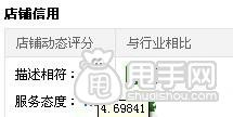 這里小編提醒大家要注意淘特萊斯的動態評分是一段時間內客戶評分的一個平均值。因此每一個參加評分的客戶的打分都會影響這個平均值的大小。當然,動態評分我們可以直接在店鋪首頁的掌柜檔案中查到,只要把鼠標放在店鋪首頁掌柜檔案里的相應動態評分上就可以看到下圖: