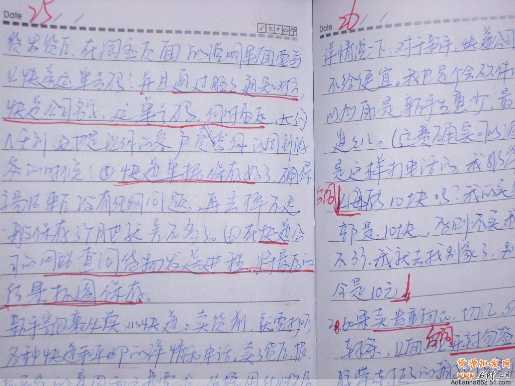 我深知,在開店初期不易著急做買賣掙錢,有得甚至賠錢呢。所以要多在社區里學習,學習,再學習。把重要的內容記錄在專用筆記本上,用紅筆畫出內容關鍵詞,以后想回頭復習,也是非常省心的。這樣,抄一遍,腦子里就多了一點印象,而且要“溫故而思新”哦! 現在,我將本人筆記本里的內容,用數碼相機拍下來。本來想用自己在社區里所學到的圖片處理技巧,讓照片更完美一些,還請各位多多諒解本人的忙碌~~ 我把圖片一一上傳,供各位參考。圖片隆重登場,大家鼓掌歡迎