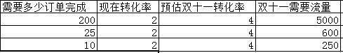 以目前的店鋪轉化率為標準,根據自己店鋪的實際情況,通過轉化率和目標訂單,預估出雙十一活動所需的流量: