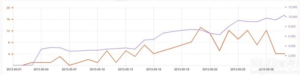 如意投的操作,本人更多的覺得,應該是在前期,而不是后臺,目前很多人關注的只是后臺,每天有多少PV,有多少點擊,引入付款多少,結算多少,我覺得這個應該要關注,但不是最主要的.做如意投,目前來說,可以參考鉆展的測試計劃,因為你不知道別人出多少價格,多少傭金,所以需要你不斷的去調整,去統計分析.但是如意投因為是站外的關系,所以這個測試周期可以去適當的放長一點,我花了一個月時間,調整了3次傭金.從開始的5%,到中間的10%,到現在的15%,我發現每一次調整,PV都會有明顯變化,但是點擊量沒有明顯變化,但是因為目前我的計劃是不超過15%(據我自己了解,目前我這個類目的,大部分淘寶客的傭金都是在10%左右),所以再后面我沒有去調整傭金率,而是去修改主圖,修改詳細描述(標題暫時不去動,因為動了標題會和搜索排名有關系).每次調整間隔大概在8-9天左右,前面傭金低的時候調整周期稍微快了一點,因為5%的傭金再怎么說也不可能有大的展現量.PV從開始的每天大概2000左右,上升到每天大概9000左右,我的第一筆如意投成交發生在5月22號,當時的傭金率是15%,PV在6000多,后來繼續優化主圖,23號之后每天都會有成交,但是量不大.都至少,說明我的操作有效果出來了.下圖是我近一個月的數據統計,很明顯的都是在往上升,只不過起伏有點大: