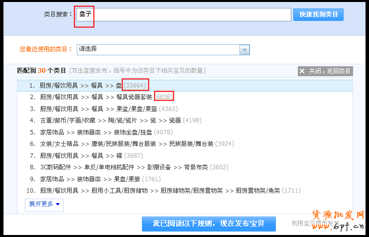 如果您所輸入的關鍵字,沒有名稱與此完全匹配的類目和屬性,那么系統會根據在線商品的標題中的關鍵字,展示出商品數量最多的前10個類目,并在每個類目后顯示對應的商品數量。例: