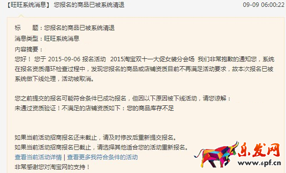 A.收到千牛或旺旺清退通知(如下圖)則代表當(dāng)前報(bào)名的商品已被系統(tǒng)自動(dòng)清退,系統(tǒng)會(huì)告知清退原因
