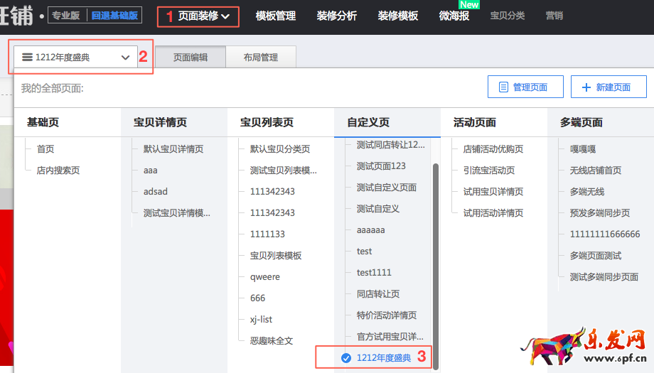 第一部:進入旺鋪裝修后臺,請點我~!→ 頁面裝修 → 點擊”頁面管理“ →自定義頁或官方預置頁