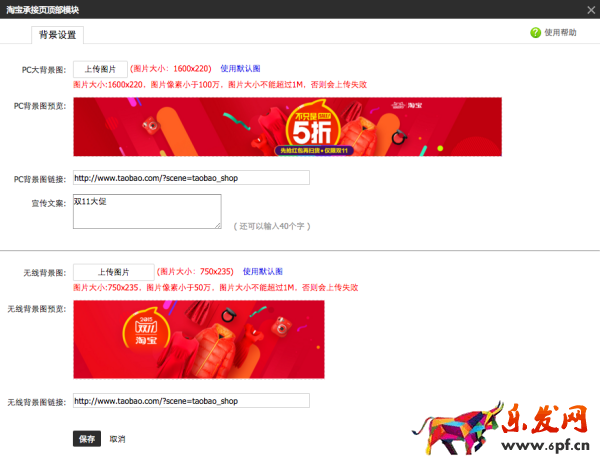 ②PC端“上傳圖片”上傳1600*220圖片,宣傳文案:系統提供默認版,可自行編輯45個字符,手淘端"上傳圖片”上傳750*235圖片