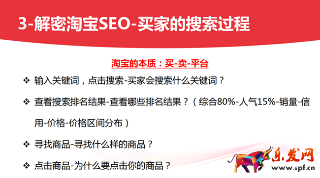 我們模擬買家的購物過程,用三張PPT截圖來說明淘寶網搜索引擎的排名原理!看一下搜索引擎是如何實現精準小而美和個性化千人千面!以及淘寶搜索引擎是如何平衡買家賣家及自身三方權益的!第一張我順便把一些關鍵點的疑問也放在里面了!