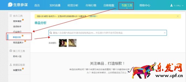 a. 打開生意參謀d.alibaba.com,選擇專題工具,進入單品分析,點擊搜索框,或者可以直接選擇系統推薦的店鋪目前熱賣單品。