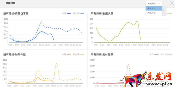 1、提供全店鋪商品實(shí)時(shí)概況和分時(shí)段趨勢(shì)圖及可切換對(duì)比模式,支持日常對(duì)比、大促對(duì)比,選擇日常對(duì)比,可支持最近90天日期,選擇大促對(duì)比,可支持最近2年大促(20131111,20131212,20141111,20141212)。
