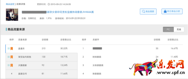 4、查看核心商品詳情,實(shí)時(shí)展現(xiàn)商品流量來源,訪客數(shù)占比、訪客數(shù) ; 默認(rèn)選中排名第一的二級(jí)來源,右側(cè)展示二級(jí)來源的明細(xì)來源,每頁展示10個(gè),PC端僅支持以下來源細(xì)分:淘寶客、直通車、鉆石展位、聚劃算、淘寶搜索、淘寶頻道、淘寶類目、愛淘寶、天貓搜索、天貓頻道、淘寶活動(dòng)、天貓活動(dòng)、淘寶站內(nèi)其他;其中天貓搜索、淘寶搜索提供TOP100搜索詞;其他提供TOP100來源URL。無線端僅支持天貓搜索、淘寶搜索,所選來源暫不提供細(xì)分來源!