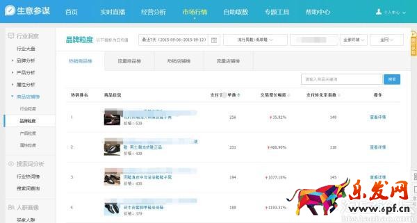 品牌粒度又分為:熱銷商品榜、流量商品榜、熱銷店鋪榜、流量店鋪榜,通過分析其他品牌相關信息,進行對自我的學習和提升。