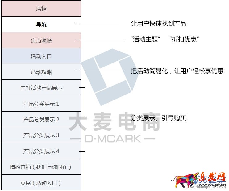在雙11期間,我們落地頁的主要作用是介紹雙11優惠活動,將盡快的將流量分流到合適的位置,促使用戶成交。那么我們落地頁的布局應該有的模塊有:店招,焦點海報,活動攻略,主打產品,產品地圖,產品分類展示等。按照重要性,從上到下排列,如下圖: