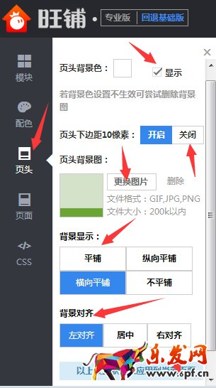 當(dāng)設(shè)置好頁(yè)頭背景圖后,得按需要設(shè)置好“背景顯示”和“背景對(duì)齊”,是“平鋪”還是“橫向?qū)R”或是“不平鋪”。