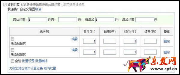 像下圖這種情況,其實在方法的設置上,跟運費模版上半部分的快遞運費是一樣的,只是這里我們設置為貨到付款。