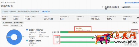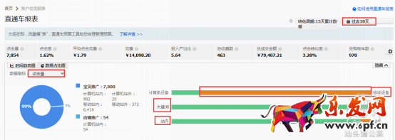 在過去30天,從流量的數據占比圖可以看出賬戶的流量主要是來自于無線端站內的關鍵詞引流,無線端的流量占比大,站外、定向及PC端的流量占比較低。