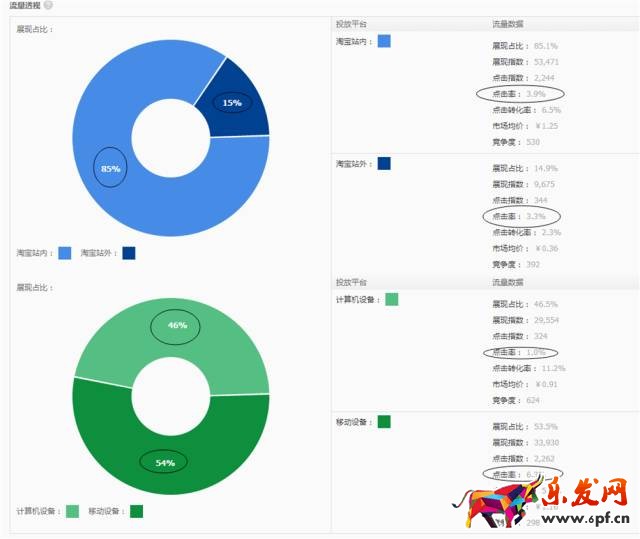 重點注意一下,這是我們做直通車每天都必須看的內容,這里圈出幾個要素,一個是站內站外的對比,還有一個就是pc和手機端的對比。通過圖上PC端和無線端不同的點擊率大家就可以類似的去選擇最有效的端口投放自己的產品以避免不必要的浪費。
