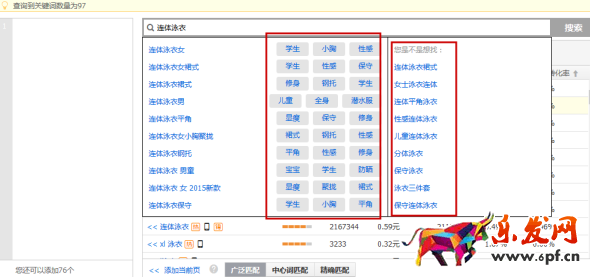 如果在搜索框里輸入一些詞,比如輸入“連體泳衣”,那么將會出現兩類詞。如下圖。左邊這一欄,是同步的淘寶移動端搜索框下的詞,屬于擴展詞;右邊這一部分,是同步的淘寶電腦端搜索這個關鍵詞后,出現的“你是不是想找”這類聯想詞。