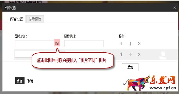 4、圖片輪播必須兩張以上才會轉(zhuǎn)動,而且添加完圖片后,還要填寫圖片地址與鏈接地址,并且調(diào)整輪播圖的播放順序。如果想添加更多 圖片進(jìn)行輪播,點擊添加,如下圖的黃色區(qū)域。