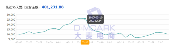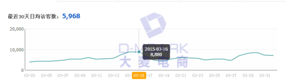 從途中可以看到,原本店鋪訪客數(shù)上升趨勢良好的,但是在3月16日突然間下滑,從8800左右下滑到5000左右,下滑幅度43%。說明訪客數(shù)直接影響到了店鋪的營業(yè)額,而且也說明了當天一定發(fā)生了什么事才導(dǎo)致了數(shù)據(jù)的下滑。
