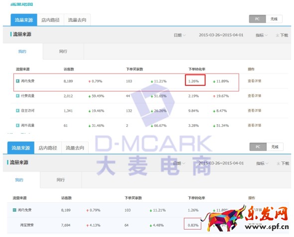 從以上數(shù)據(jù)可以反映出,店鋪的轉(zhuǎn)化率主要是受PC端的影響,下降幅度較大,而且后期也沒有上升的趨勢。初步判斷可能是PC端的某個引流渠道有異常或者高流量的寶貝轉(zhuǎn)化率太低,以至于拉低全店的轉(zhuǎn)化率。