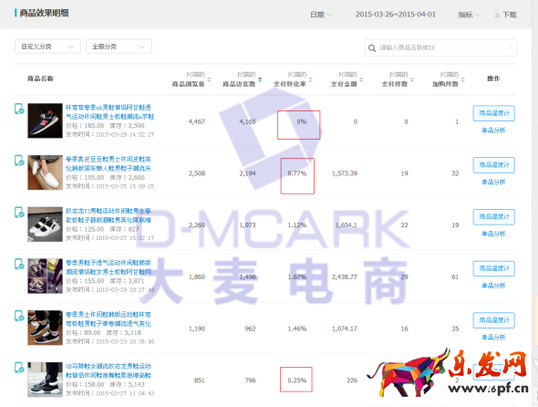 從PC端的單品轉(zhuǎn)化率來看,根據(jù)訪客數(shù)排序,主要是圖中三款寶貝的轉(zhuǎn)化率影響較大。特別是第一款,流量占比最高,但是卻沒有轉(zhuǎn)化。