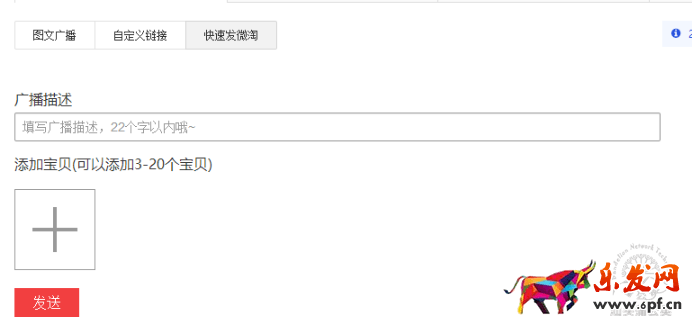 圖文廣播:這是最普遍的發(fā)微淘的模式,一般都是圖片加文字,可以通過宣傳自己店鋪的新品寶貝,放置新品圖片,加上一些文案進(jìn)行推送。