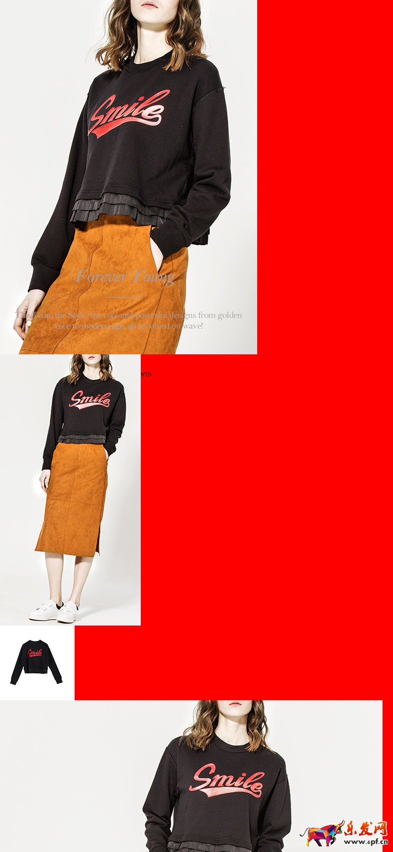 圖片(一)的顯示效果是由圖片(二)和圖片(三)兩張圖上下疊加而成,圖片(三)經過了PS簡單的加工,加入了品牌當年的流行slogan:Forever young(永遠年輕!),MO&Co.去年一年的商品詳情頁里面第一張圖都是墊的這個底(圖片三),主要是因為我們開始琢磨這個代碼+模板化上新的時候雖然也有過這種通用圖片多樣化的思考,但更多的時間其實是在溝通并思考如何通過流程、團隊分工和技術把所需要銷售上新的商品很藝術并且快速的進行電子化,3月著手開始做設計的時候,剛好趕上做夏季商品上新,設計師峰美女就直接這樣設計了,后面隨著工作量逐步的加大,這種進一步的優化就基本上只能停留在想的階段了。