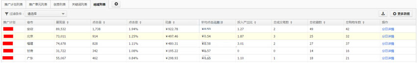 地域列表能直觀的了解到各個地區,各個計劃的直通車投放情況,可根據展現量,點擊量,點擊率,投入產出比的高低,對不同地域進行投放,比如臨近初夏時,停止羽絨服對南方地區的投放。