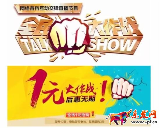 顏色方面我們模仿一些網(wǎng)上的圖片做參考,我們可以找到很多“1元秒殺”、“1元包郵”等字樣的banner,大多數(shù)都是黃底紅字或者紅底黃字。我的文案“1元大作戰(zhàn)”是本文案中的重點(diǎn),基本和他們類似。因此我選擇參考他們的。