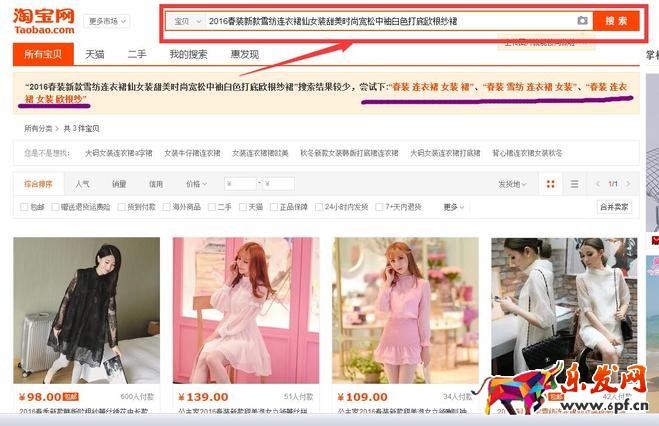 因?yàn)槟闼训氖侨P(guān)鍵詞,搜索的結(jié)果很少,所以,淘寶就給你指定了關(guān)鍵詞,這里指定的就是“春裝 連衣裙 女裝 裙”、“春裝 雪紡 連衣裙 女裝”、“春裝連衣裙 女裝 歐根紗”。