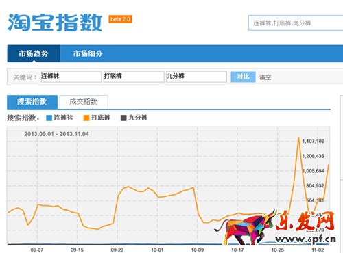 比如說,銷售的是連褲襪,那么關鍵詞可以是連褲襪、打底褲、九分褲等。然后我們把這三個詞都輸出淘寶指數搜索框,對比如