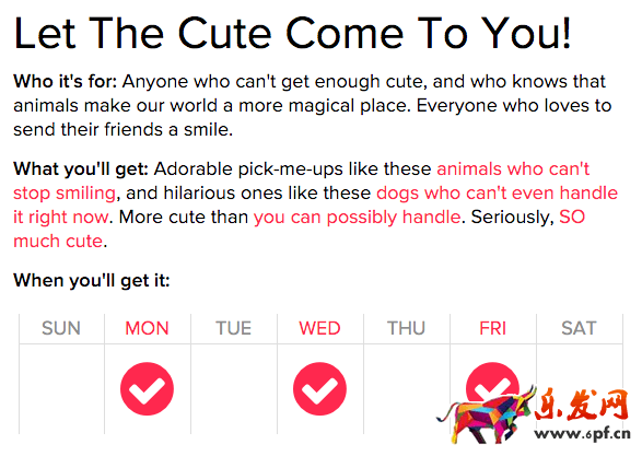 The BuzzFeed Animals 的郵件是一個很好的例子。在你正式注冊訂閱之前,他們會告訴你所屬的細分組,以及何時可以收到郵件,關于哪些內容。這種方法非常有效的,可以幫助你與你的用戶建立初步的信任關系。基于IP地址和一些你初步獲得的其它用戶基礎數據,你還可以進一步優化你的郵件發送計劃,讓細分更精準,內容更個性化。