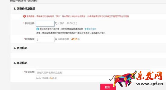 這里沒啥可說的,一般報名的價格,淘寶默認的是30天內最低價的9折,當然了,在小二眼里,性價比越高,他們越喜歡。(最低把控不要虧本)至于團購數量,也就是庫存,要把控的就是報名貨值,(庫存*報名價格=貨值)需要注意的是,各個類目都有他們各自的最低坑位產出,可以根據類目最低坑位產出上下浮動20%報名。