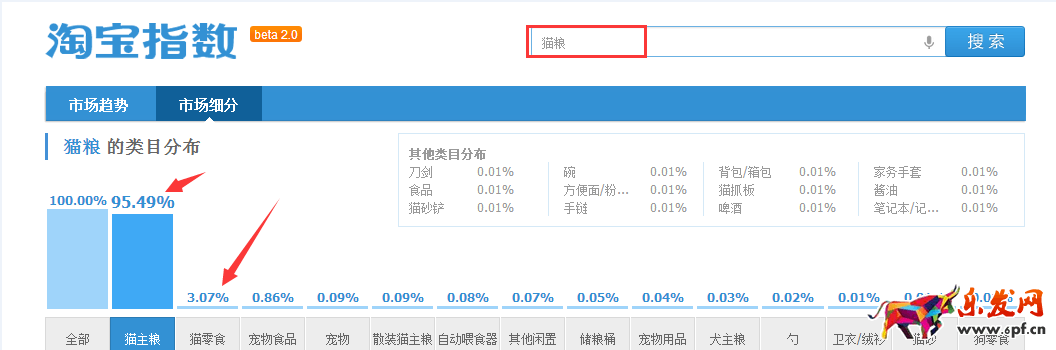 通過狗糧、貓糧、和寵物用品3個二級類目詞,我們獲取的信息是狗糧為主要大類。然后咱們繼續往下看: