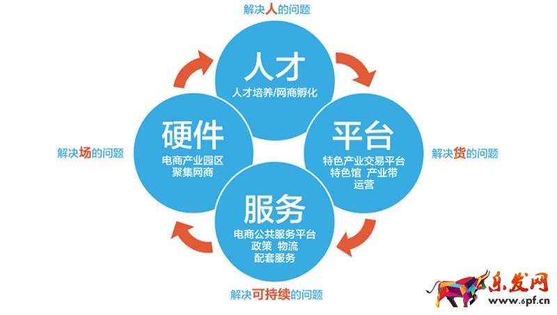 縣域電商的發展,不外乎四大要素:人才、硬件、平臺和服務,分別對應解決人的問題、場的問題、貨的問題與可持續的問題。