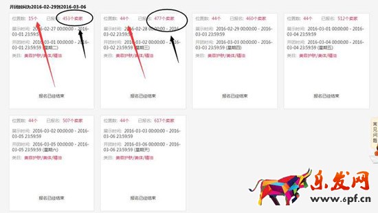 圖上可以看到,有位置數和已報名的賣家數,針對沒上過的店鋪,建議報名賣家數少的,坑位多的時間,通過比較容易。這里是相對來說~~一般禮拜6,禮拜7報名的賣家數少點,相對應的,這兩天由于大市場的原因,淘搶購的流量相對應的少些。