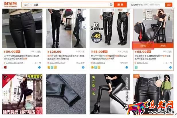 打開淘寶搜關(guān)鍵詞,搜索“皮褲”,然后找到自己的款式,點(diǎn)擊找同款: