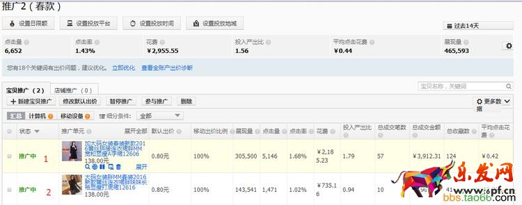 分析:如上圖,紅色方框的這2款寶貝,在銷量和人氣上,都是屬于店鋪中是較高的,同時寶貝是新品應(yīng)季的春款寶貝,同時在寶貝的詳情頁上,細(xì)節(jié)圖與模特展示圖都較為全面,適合在直通車上進(jìn)行推廣測試。