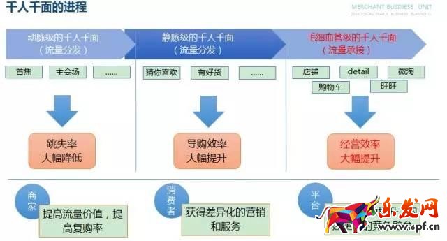 在這兩個背景下,千人千面的發展大致經過了三個不同的階段,第一個階段是設置不同的會場,第二個階段則是猜你喜歡的推送階段,而目前就是第三個階段,之前針對用戶的推送都是在流量大池中完成的,但是這個階段的千人千面是實現商家到店流量的精準運營。