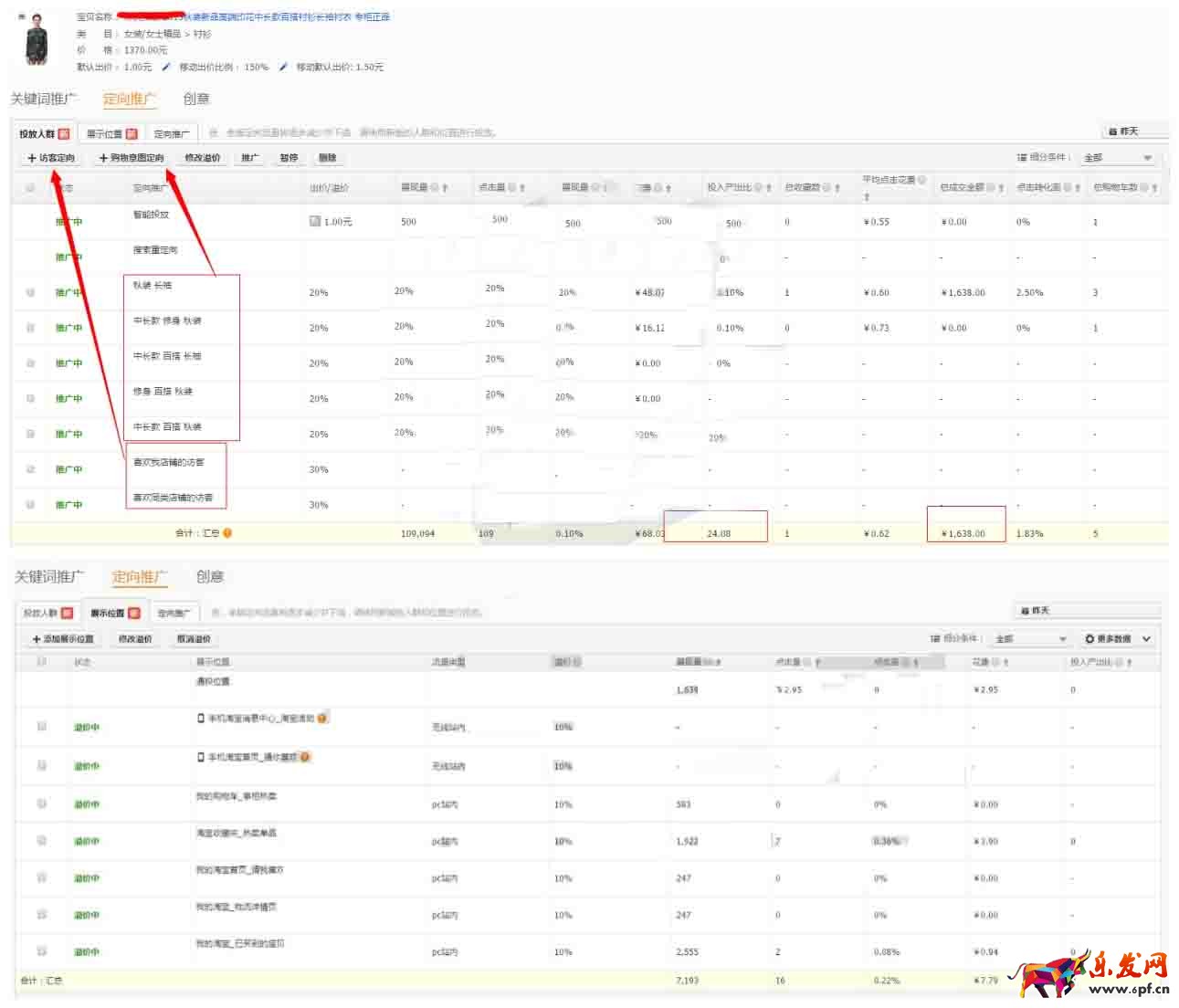 4、無線定向:寶貝計劃投放無線后在寶貝的定向推廣優化投放人群(訪客定向和購物意圖定向)以及添加展現位置溢價去圈定人群定向投放寶貝。如下圖所示。