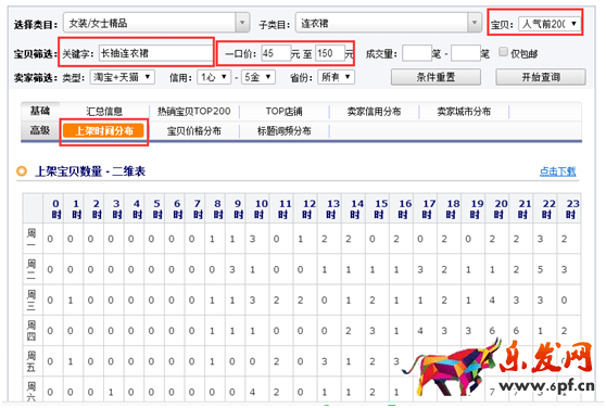 我擦,這玩意兒還要配合!!!當然需要,說過很多次,店鋪做的好不好,其實都是一個又一個的細節堆積到一起的,這一點我做到了,你沒有做,至少在這個得分上,我就取得了領先。。我們假設一下,你準備重點優化的關鍵詞,根據店鋪的實際情況,準備是:長袖連衣裙。路徑:生e經——行業分析——我的情報——情報助手——選擇好類目——寶貝按人氣前200排序——填好關鍵字——選擇好你準備競爭的價格區間——點擊上架時間分布,看下圖:哎呀,我去!!!這數據太牛逼了吧!是的,太牛逼了!(注:截圖都是截了一半兒,不完全,然后數據可以下載!)