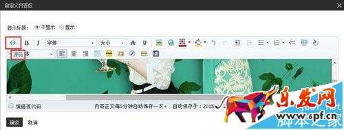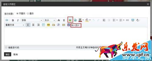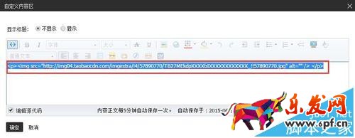 4、編輯自定義內(nèi)容區(qū),并插入圖片,將之前復(fù)制好的圖片代碼粘貼進(jìn)圖片地址,點(diǎn)擊確定